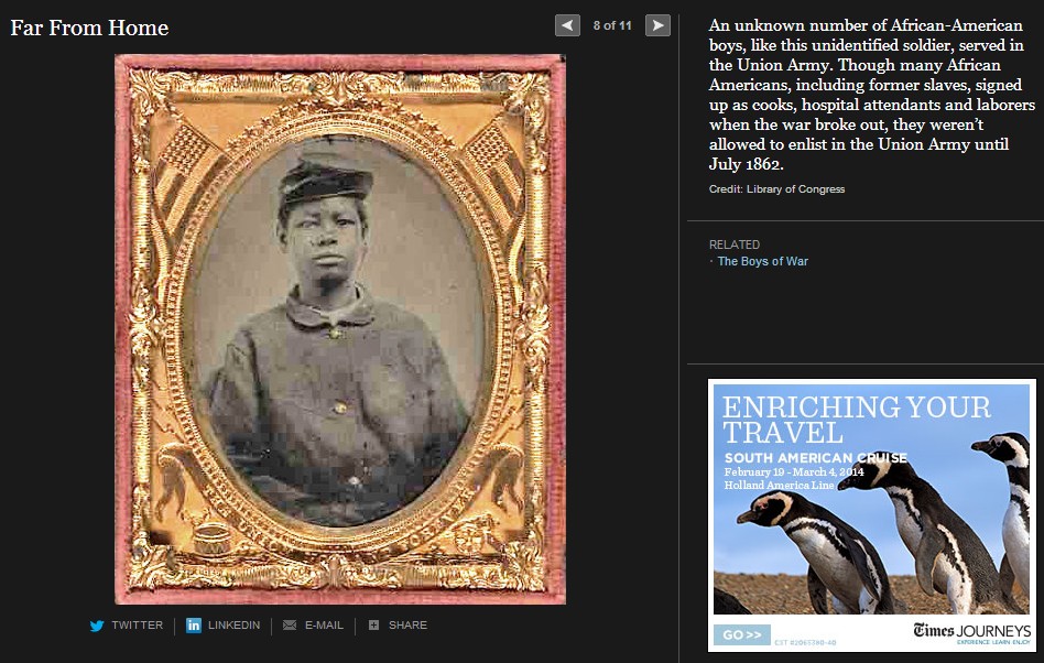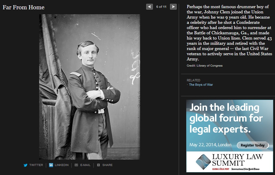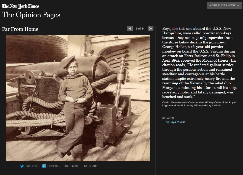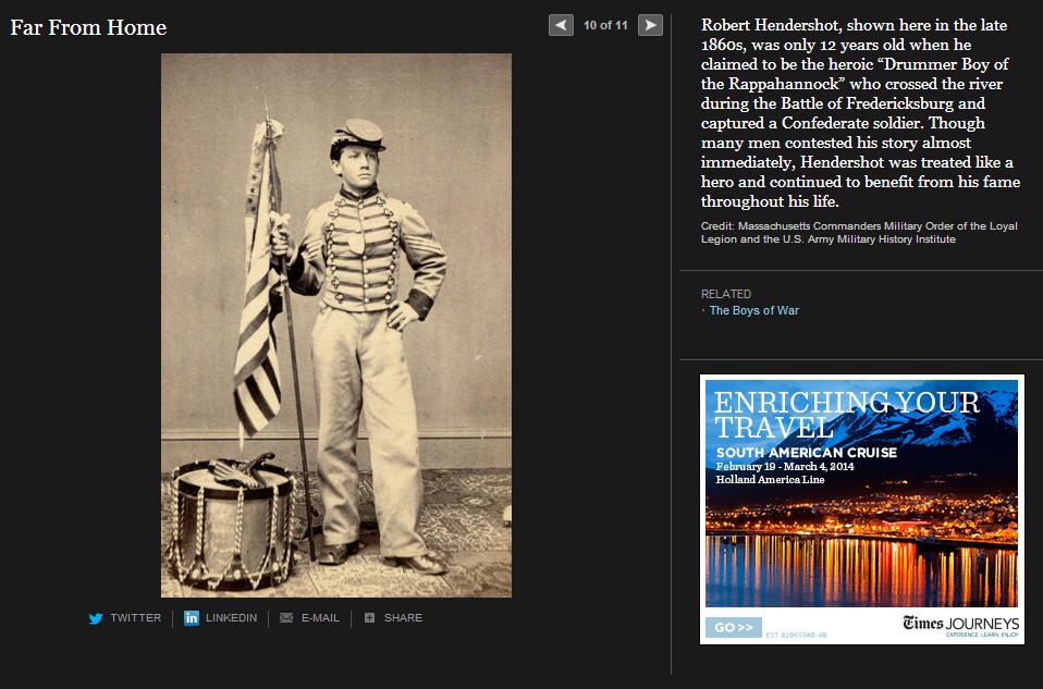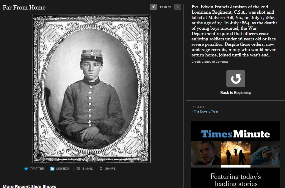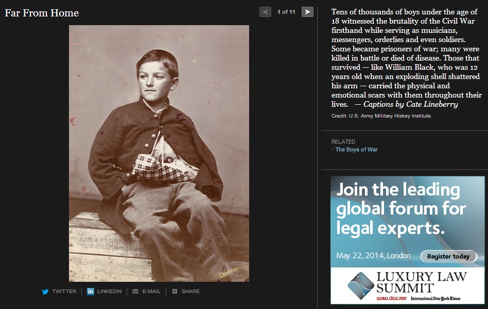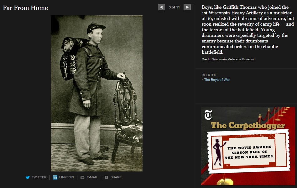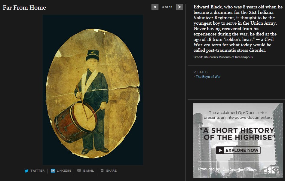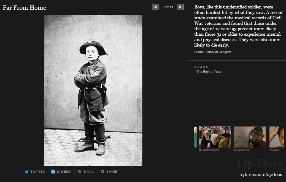 ニューヨークタイムス紙は、南北戦争150年を捉えて様々な特集を組んでいるが、この The boys of war( Far From Home, The opinion Pages, 2011) もその一つである。南北戦争は5年間に実に60万人の戦死者を出した世界最大の戦争となるが、写真が戦場の実相を伝えた最初の近代戦でもある。戦場に累々と横たわる死者たちを活写した写真報道は当時の人々に大変な衝撃を与えた。そしてこの戦争は何万人という少年たちが参加した戦争でもあったのだ。このThe boys of war に登場する少年たちはそのほんの一部であるが、彼等の人生を通して少年兵たちの体験が見える。彼等は史上初の近代戦(速射のきく元込め式の銃と大砲、装甲鋼鉄船や潜水艦の登場)の中で、当時の言葉で soldier’s heart に苦しんで若死にしていく。 soldier’s heart とは戦場のトラウマから立ち直れないまま、その生を早く終えてしまう戦争帰還兵を称した当時の言葉である。少年兵たちは多くが鼓笛隊のドラマーであったが、これも悲劇の原因であった。ドラマーは士気の鼓舞だけでなく、指揮官の命令を伝える重要なシグナル手でもあった。そのため重要な狙撃目標として銃弾に倒れることが多かったのだ。ジョンフォード監督、ジョンウエインとウイリアムホールデン主演の「騎兵隊」では、南部深く進出した北軍騎兵隊が、南部の幼年学校の幼い兵士たちの攻撃に逃げ出す牧歌的なシーンがあったが、実際の戦場はずっと過酷だったのだ。